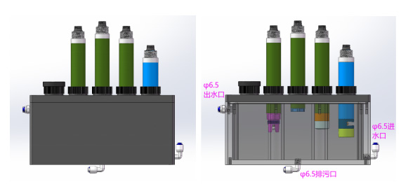 供水水质监测微系统由供电单元、传感器数据监测单元、显示单元、流通池单元和远程通讯单元及集成箱主体单元组成。